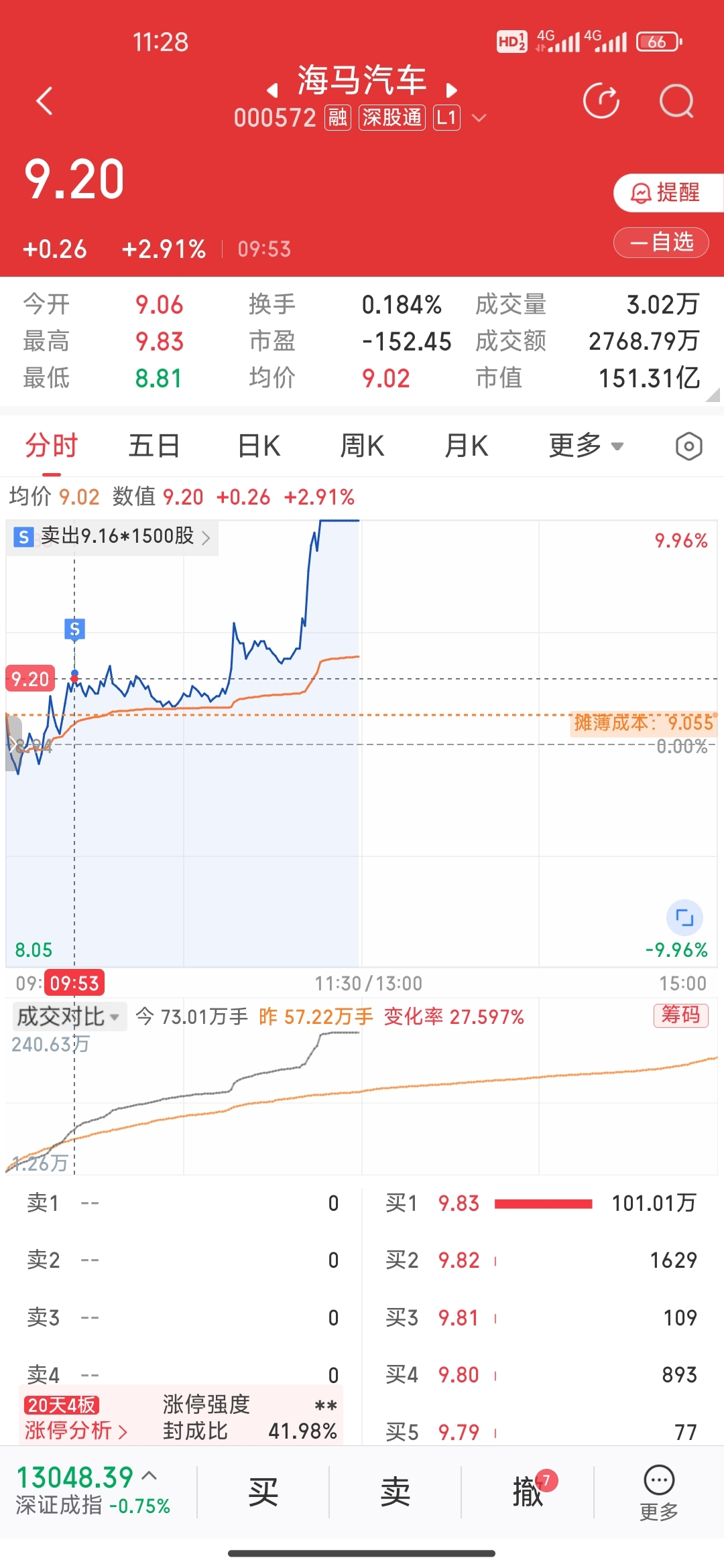 $海马汽车(SZ000572)$ 好气哦,没拿住,9.16卖出。错过一个涨停