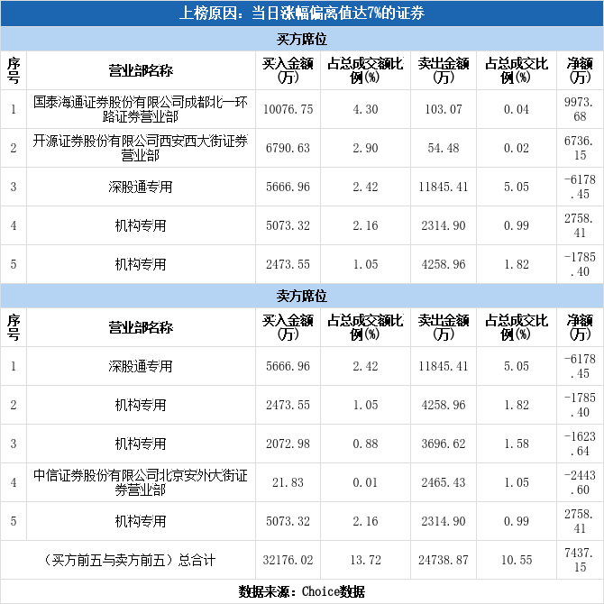 今日龙虎榜单上出现了深股通的身影,占据了买三、卖一的位置,净卖出6178.45万元,占当日成交总额的2.63%,是遭深股通净卖额最高的个股。除此之外深股通还参与到了航天发展、平潭发展、赛微电子等14只个股中,其中11家呈现深股通净买入,获净买入最多的是航天发展,净买额为2.38亿元;3家呈现深股通净卖出,遭净卖出最高的为雷科防务,净卖额为5614.98万元。