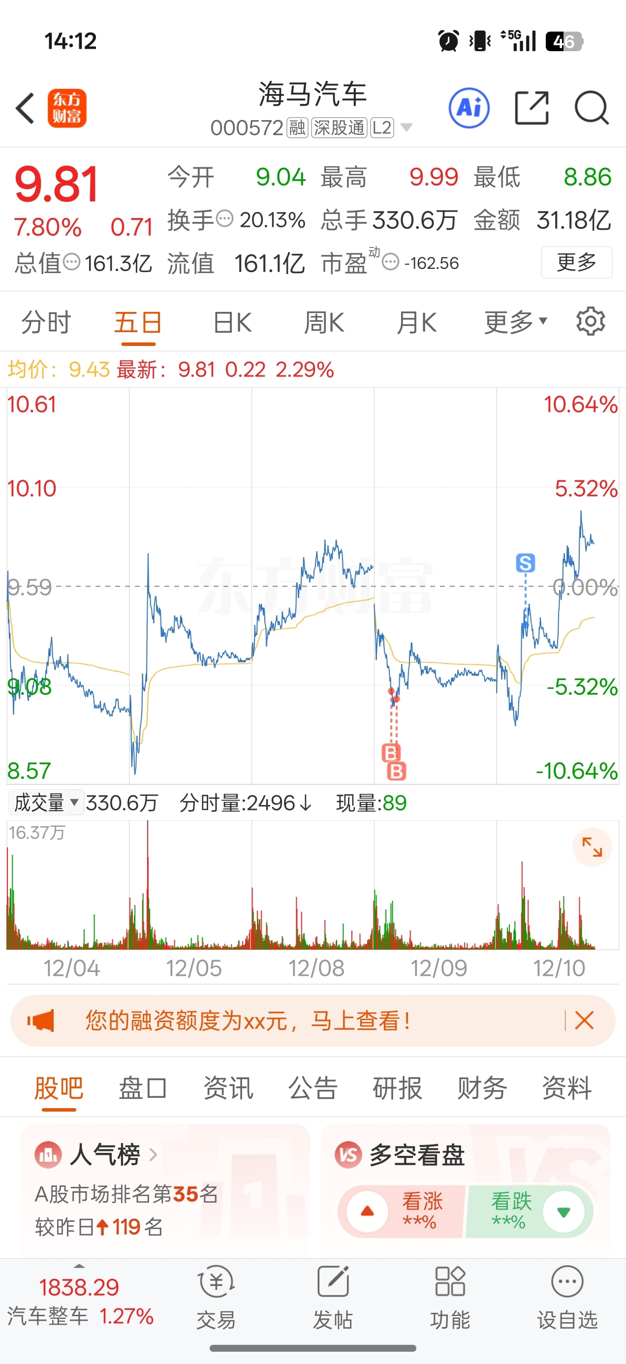 $海马汽车(SZ000572)$ 我真是一点格局都没有