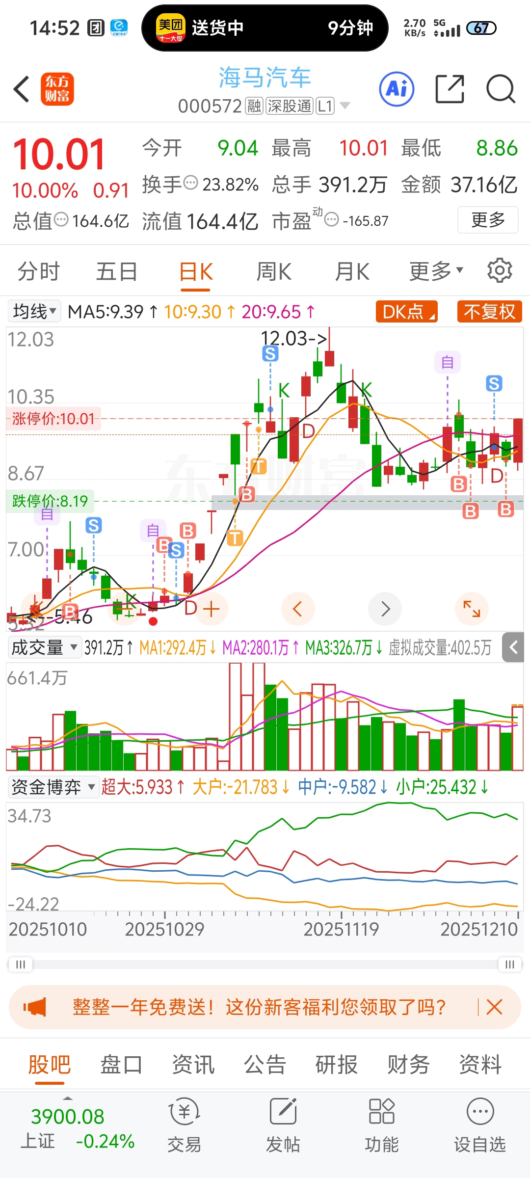 $海马汽车(SZ000572)$ 埋伏4天只为今天,果然没看错你