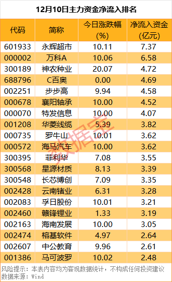 永辉超市连续3日涨停,今日主力资金净流入7.37亿元,居于首位。商业百货近期持续走强,今日涨停的个股包括中百集团、东百集团、步步高等,步步高、中百集团也获主力资金大幅净流入,金额分别为4.58亿元和2.13亿元。