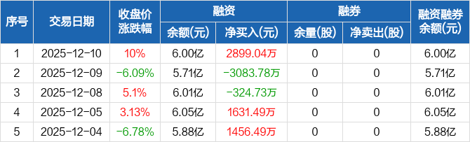 融资方面,当日融资买入3.06亿元,融资偿还2.77亿元,融资净买入2899.04万元。融券方面,融券卖出0股,融券偿还0股,融券余量0股,融券余额0元。融资融券余额合计6亿元。