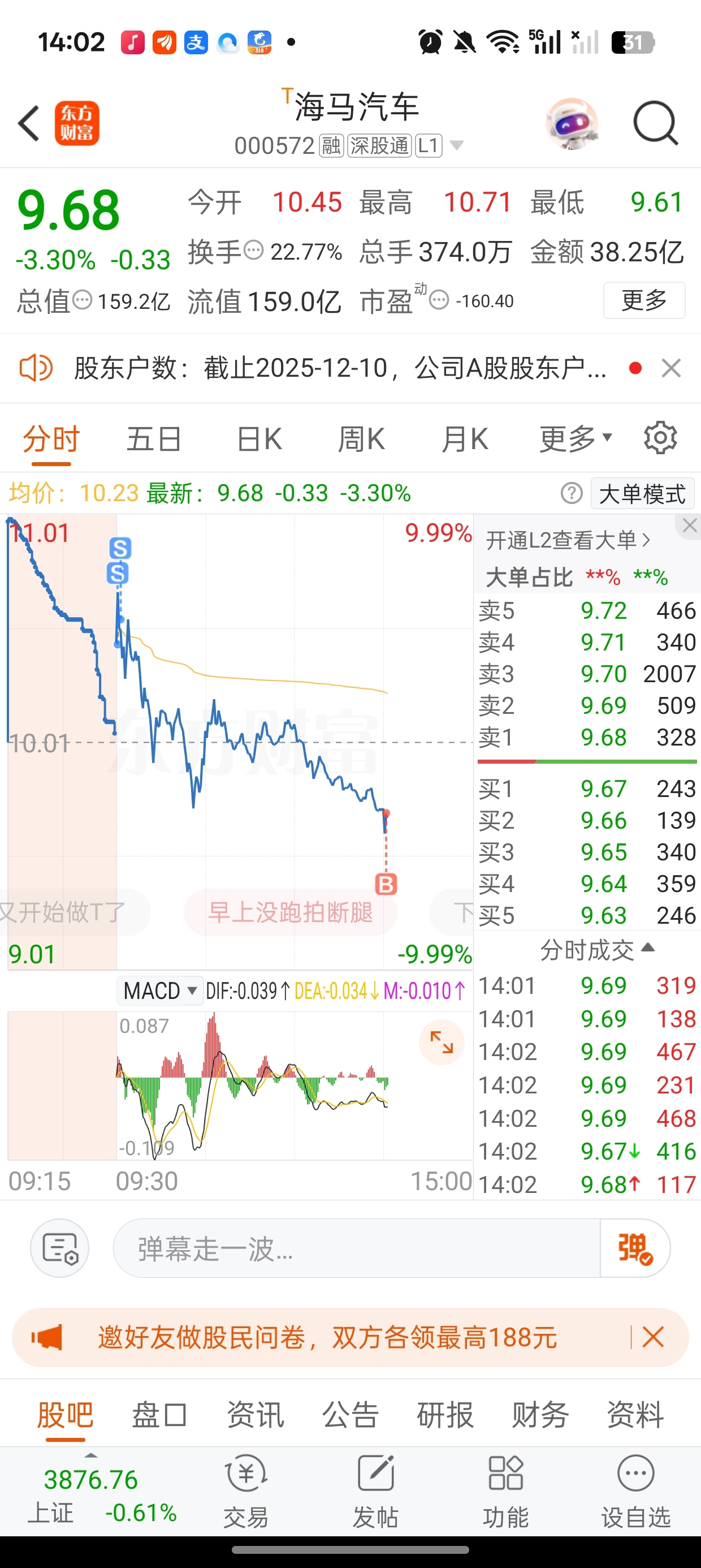 海马汽车我接回了,可惜没有买到今天的低点,本来一开始是标的是9.58,见没有砸到