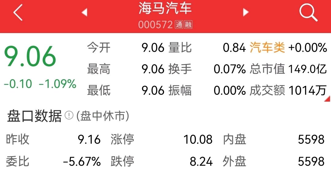 $海马汽车(SZ000572)$ 内外盘5598,好吉祥的数字。