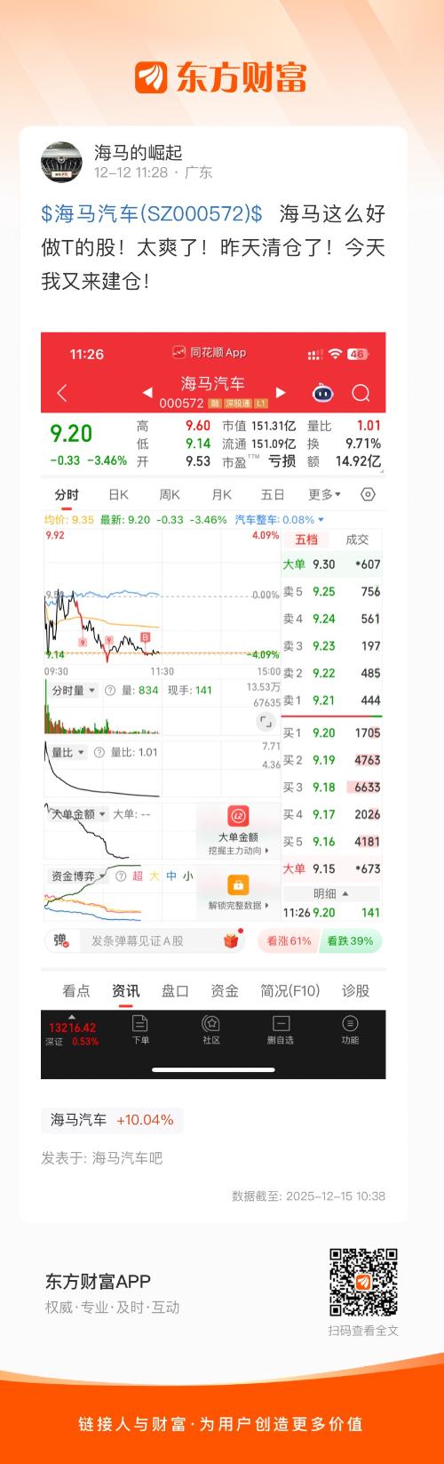 $海马汽车(SZ000572)$  海马这么好做T的股!太爽了!昨天清仓了!今天我又来建仓!