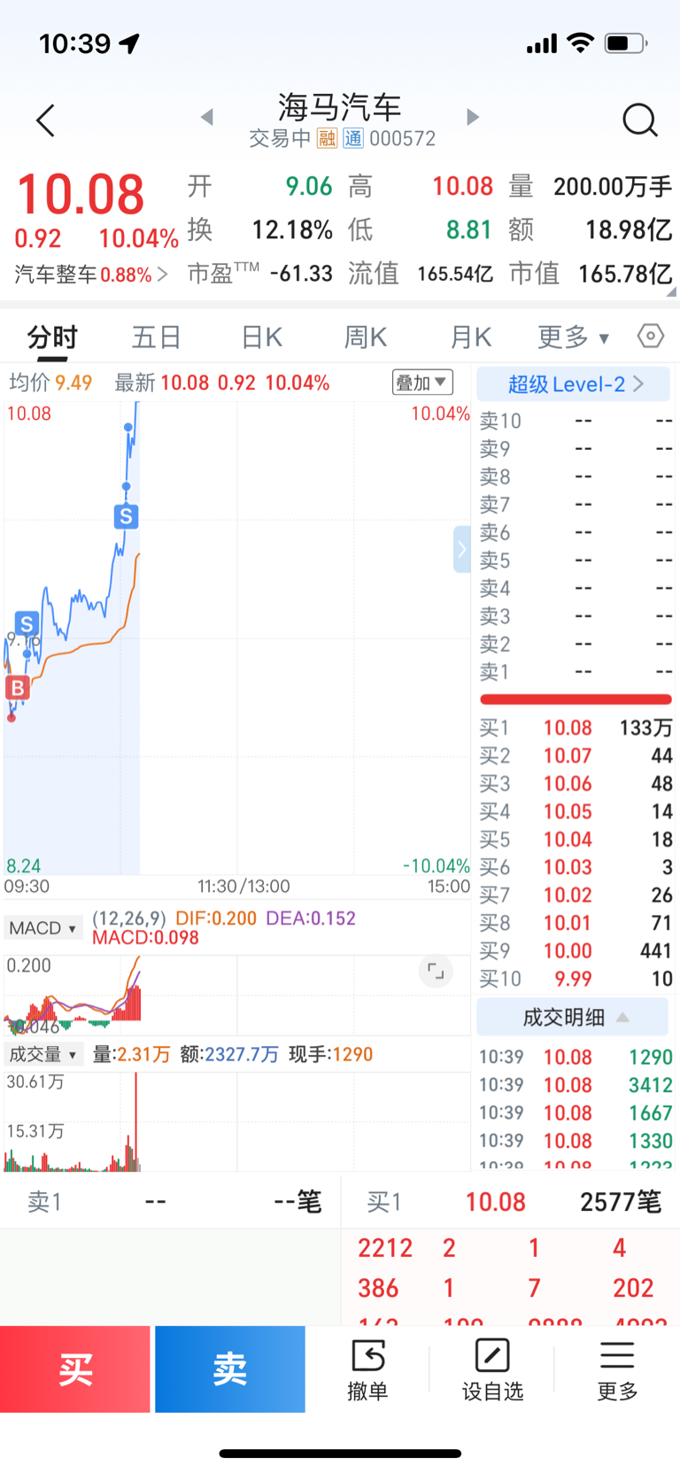 $海马汽车(SZ000572)$ 海南股的股性大家都了解了吧,服不服?真的没法说,今天如果回封,那明天就是加速去做双顶,不回封就不知道怎么走了,反正我又跑了9层仓位,1层仓位是今天最低点加的,没改多加,大家随机应变吧,心脏不好的,有盈利的就撤,被套的不愿意走,就看天意吧