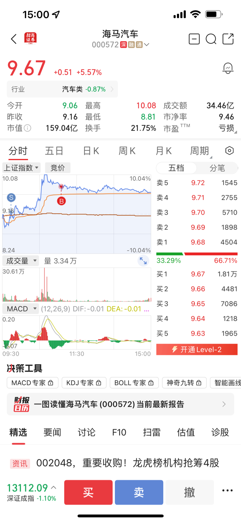 $海马汽车(SZ000572)$ 无语了,9.5的成本搞成10.1了,这个票挣三万多没跑,连着两天跌了十几个点,开盘又下杀-3,以为没戏了,挂了9.2卖,谁能知道你能拉涨停,气的9.8又接回来的,本来回本还能挣两万,现在涨5个点还亏钱。哎,里外里亏大了!
