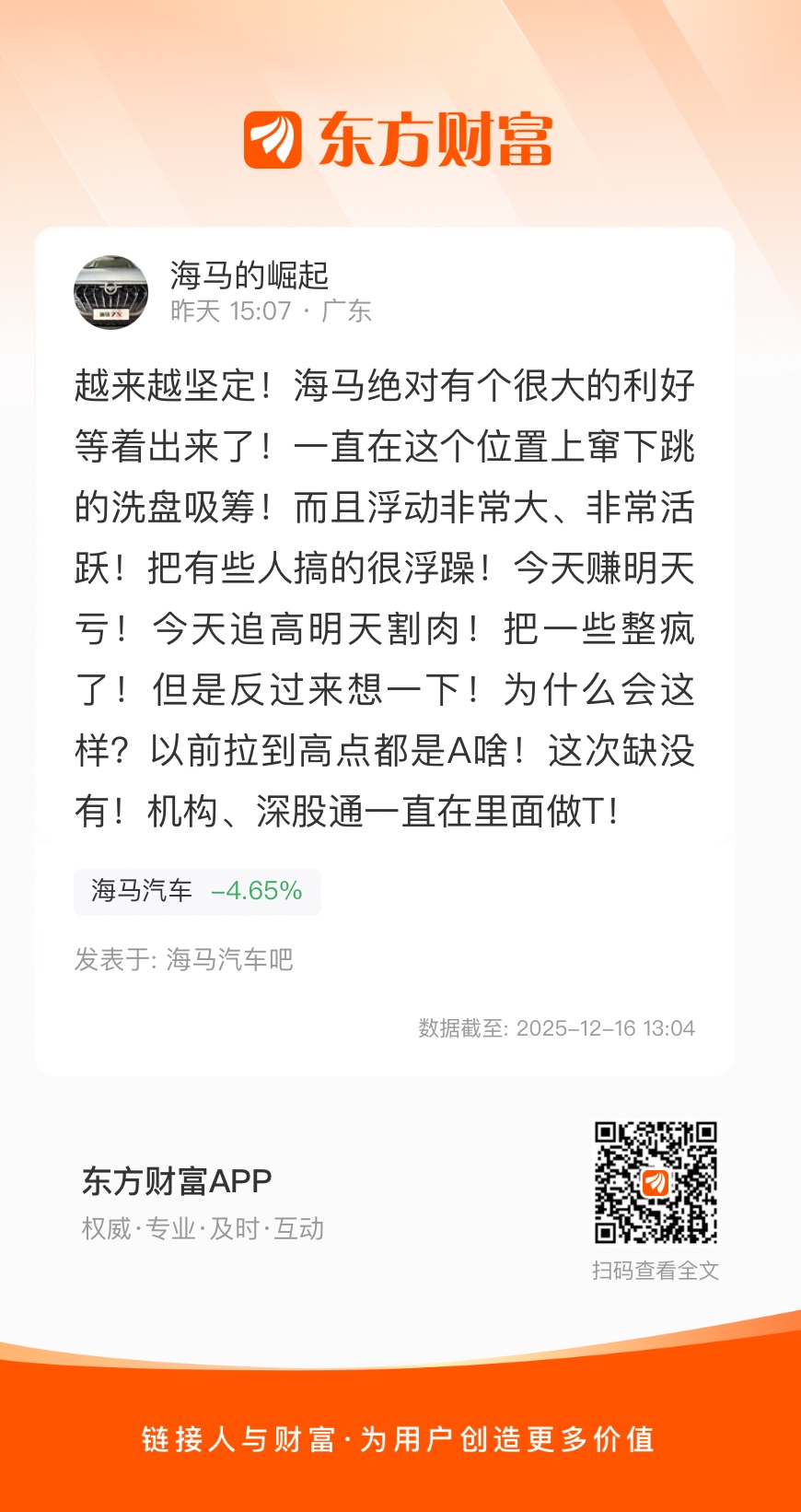 越来越坚定!海马绝对有个很大的利好等着出来了!一直在这个位置上窜下跳的洗盘吸筹!而且浮动非常大、非常活跃!把有些人搞的很浮躁!今天赚明天亏!今天追高明天割肉!把一些整疯了!但是反过来想一下!为什么会这样?以前拉到高点都是A啥!这次缺没有!机构、深股通一直在里面做T!