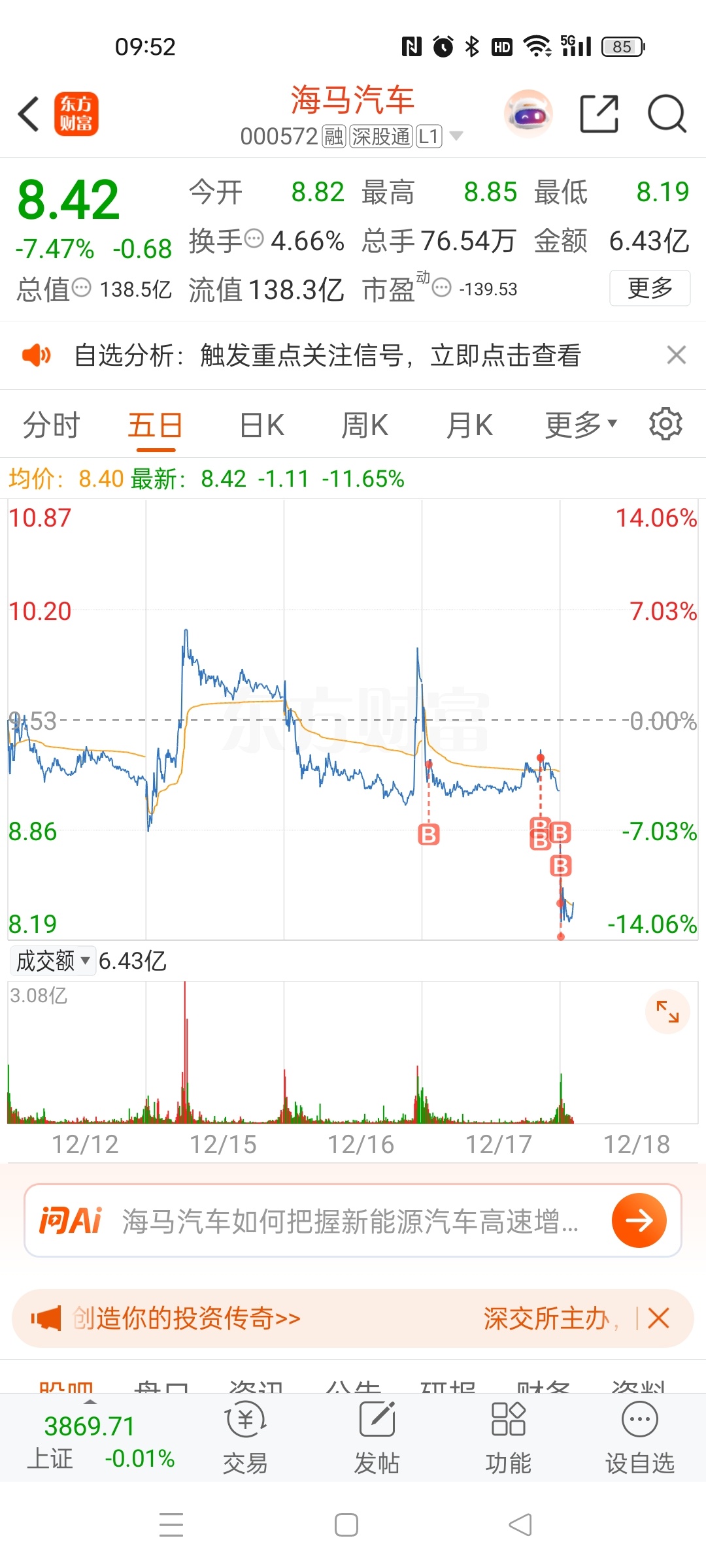 $海马汽车(SZ000572)$ 今天要么涨停,要么跌停。收盘不涨停就可以全卖了。半年内也不用再看了。