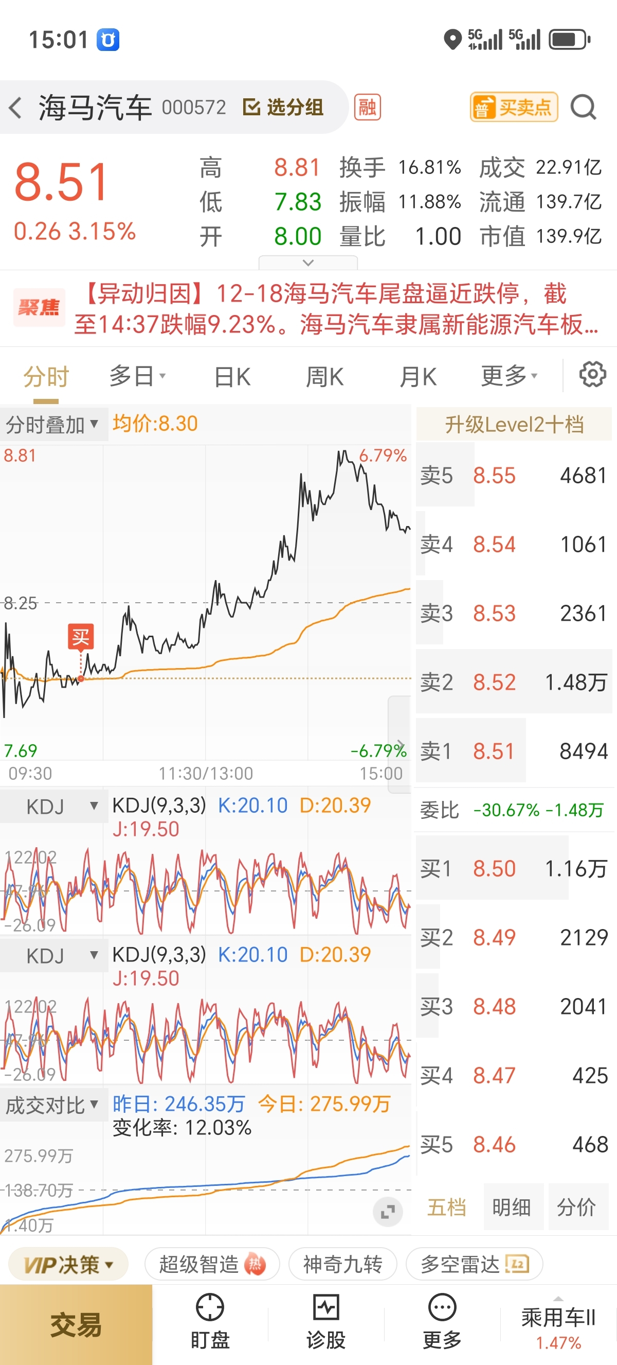 $海马汽车(SZ000572)$ 可惜尾盘跌下来了 周一能全身而退吗。