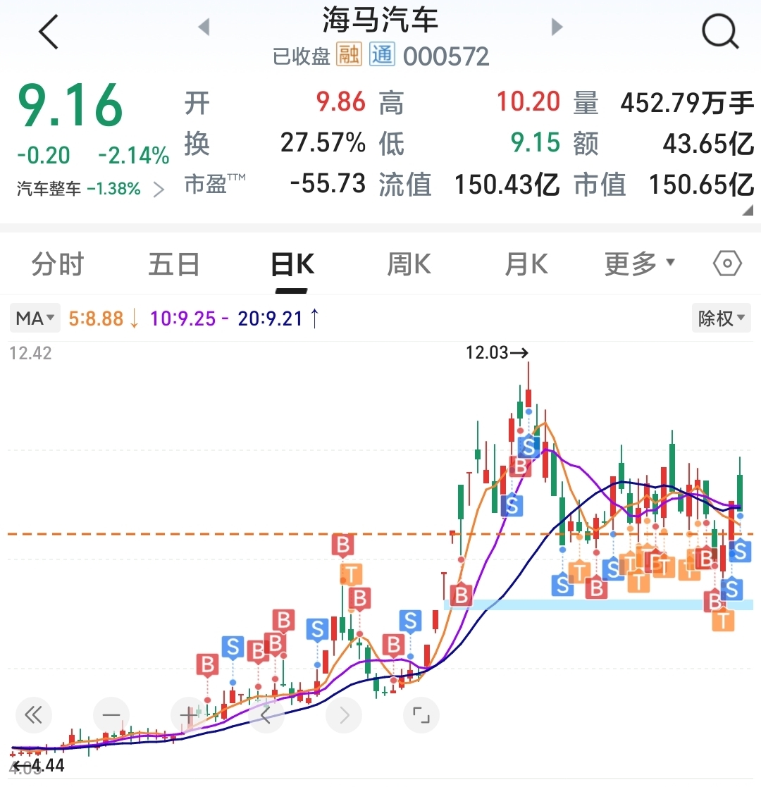 $海马汽车(SZ000572)$ 我的海马结束了,今天在海马上居然没有赚钱,可笑吗?今天分了两份走的,一份11:30,一份格局到尾盘。或许是浮盈给了底气,或许是玩久了有了感情,但格局总会换来失望,感谢海马带我赚了这么多,留下的大家发财。