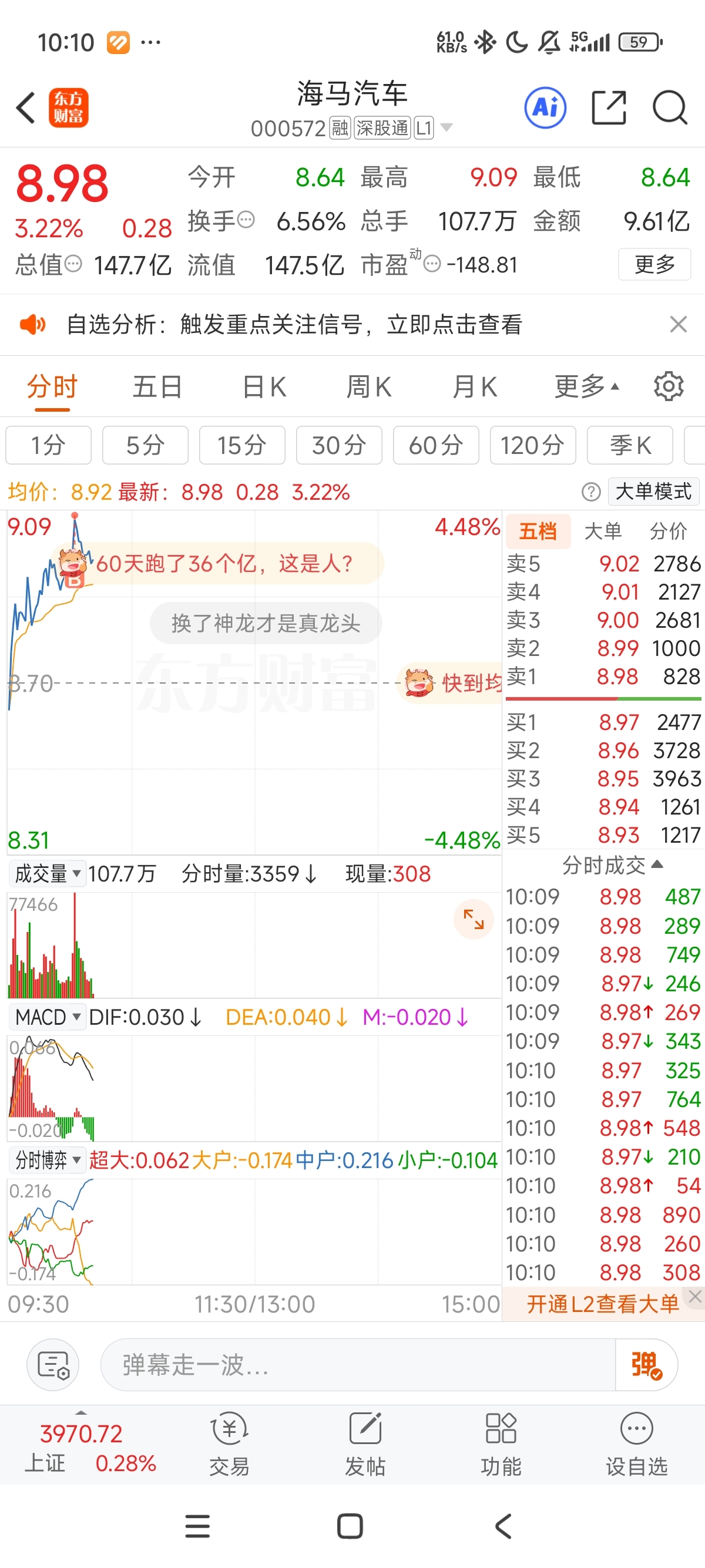 $海马汽车(SZ000572)$ 兄弟们不好意思,这个股我看了一个月,今天出手就买在山顶,高处不胜寒!