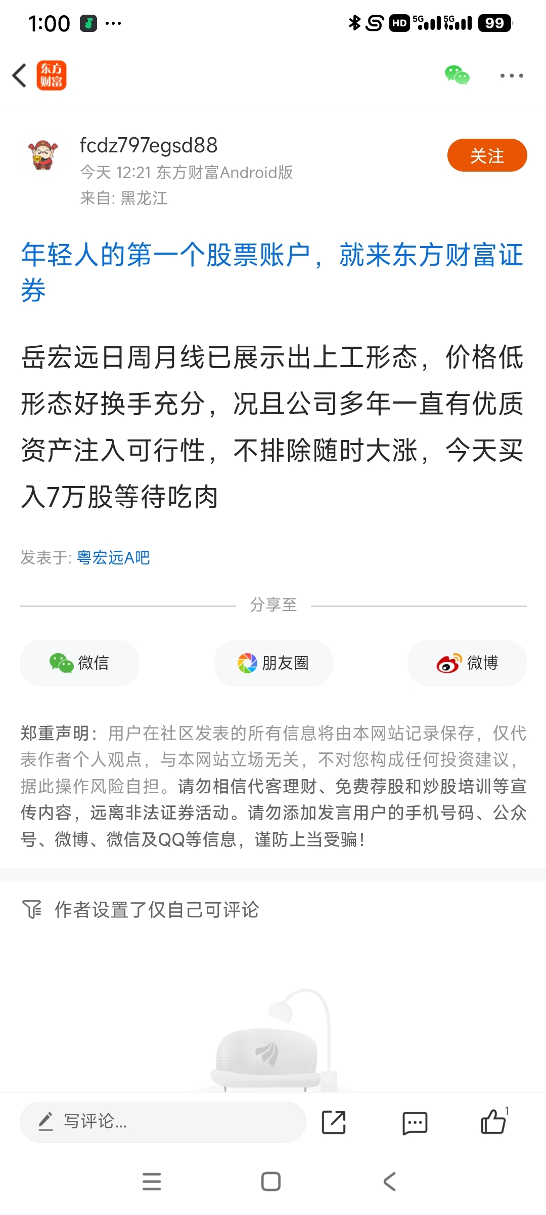 温馨提示: 1.根据《证券法》规定,禁止编造、传播虚假信息或者误导性信息,扰乱证券市场;2.用户在本社区发表的所有资料、言论等仅代表个人观点,与本网站立场无关,不对您构成任何投资建议。用户应基于自己的独立判断,自行决定证券投资并承担相应风险。《东方财富社区管理规定》
