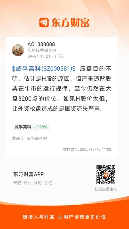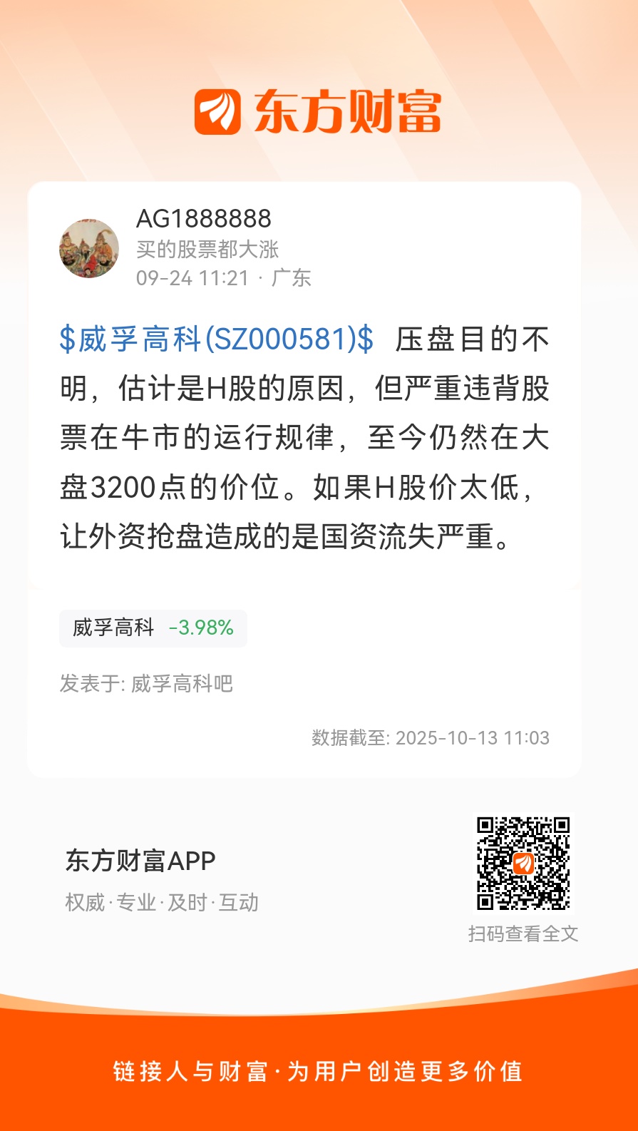 $威孚高科(SZ000581)$ 压盘目的不明,估计是H股的原因,但严重违背股票在牛市的运行规律,至今仍然在大盘3200点的价位。如果H股价太低,让外资抢盘造成的是国资流失严重。