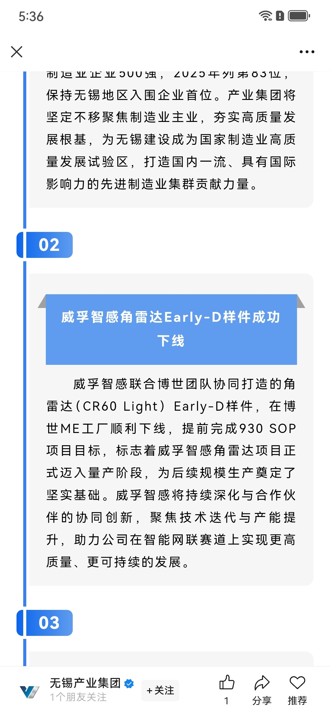$威孚高科(SZ000581)$ 无锡产业集团公众号说威孚智感的角雷达量产了