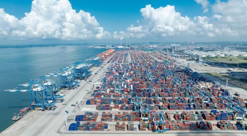 北部湾畔,碧波万顷。在钦州港大榄坪南作业区,多艘大型集装箱船停靠,巨型桥吊如钢铁巨人般精准起吊集装箱,一辆辆无人驾驶智能导引运输车往来穿梭,把集装箱像积木一样运送到指定地点,呈现出一片繁忙景象。