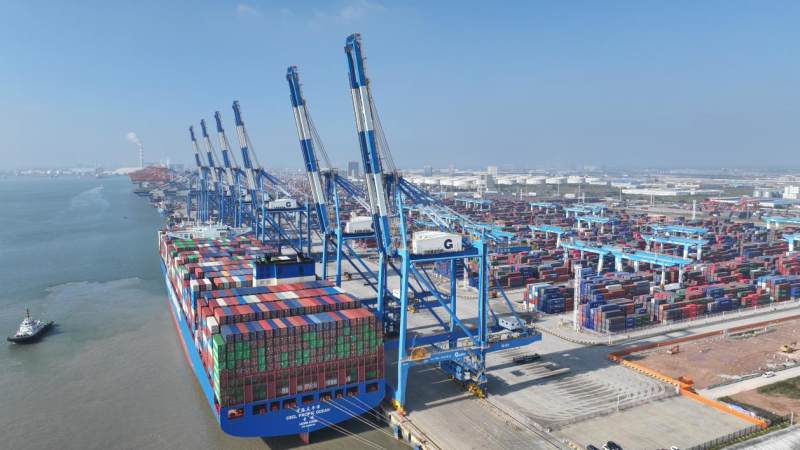 “我们首创的U型堆场布局,可以让外部的集装箱卡车直接进入堆场,直达目标位,减少码头设备移动频次,大幅降低了设备投资成本和后期运维成本。码头还在岸桥上应用了滑轨式智能OCR理货识别系统,进一步优化岸桥的作业流程。”杨锋表示,钦州自动化集装箱码头投入运营以来,不断刷新效率纪录,在2025年5月创下了54.8自然箱每小时的桥时记录,目前平均桥吊效率同比提升13.7%。