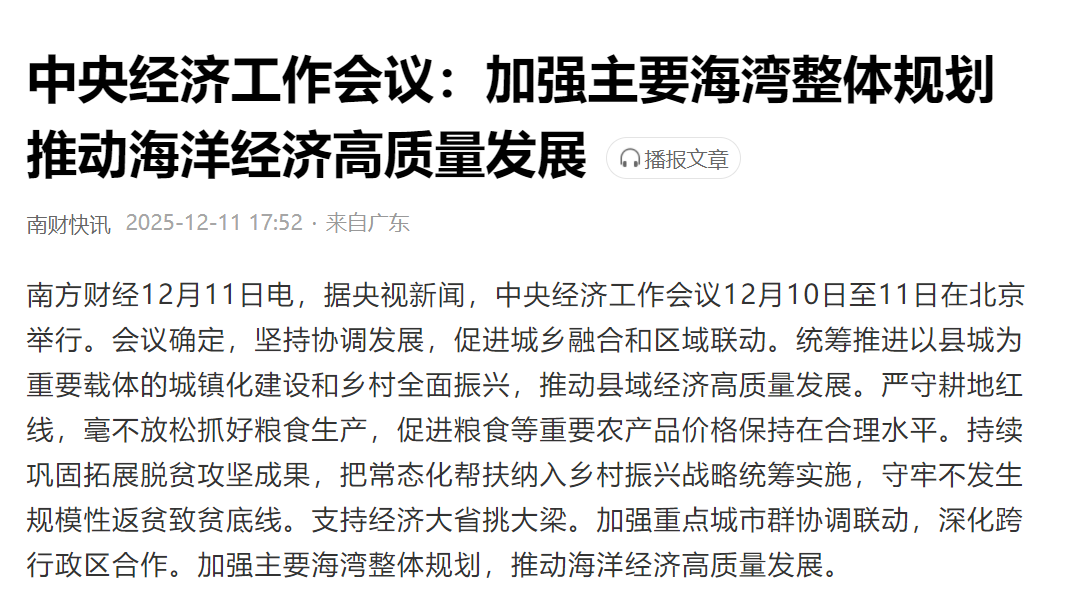 中央经济工作会议:加强主要海湾整体规划 推动海洋经济高质量发展