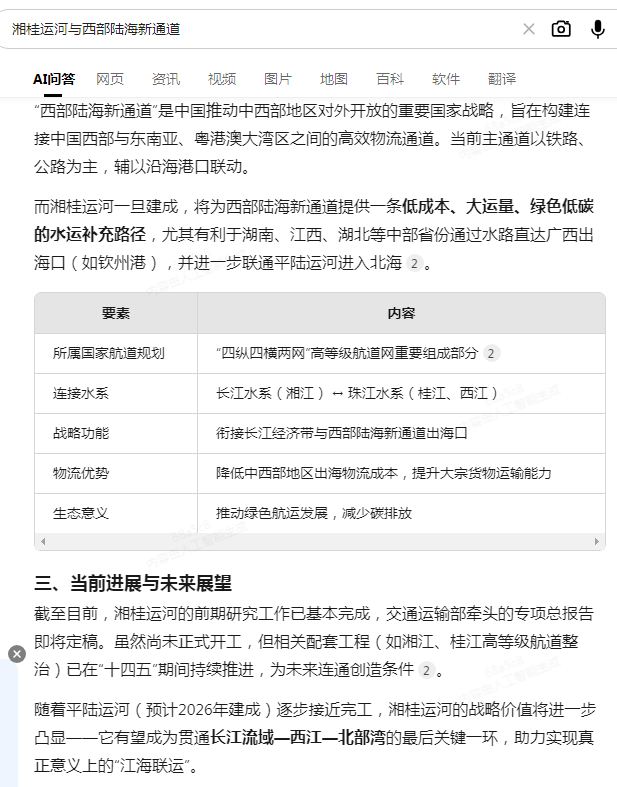“十五五”规划建议中的第七条第(24)点说到“加快西部陆海新通道建设”。2020年7月交通运输部印发的《内河航运发展纲要》提出建设“四纵四横两网”的高等级航道网,其中汉-湘-桂通道部分即为湘桂运河,次年6月,交通运输部进一步明确2035年初步建成该航道网。2024年6月,交通运输部再次强调持续推进平陆运河建设,并指导深化湘桂运河等前期研究论证。下面陈述湘桂运河与西部陆海新通道的关系: