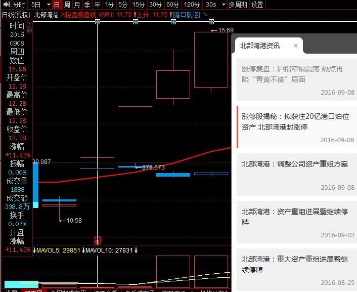 2016年北部湾港公布定增收购母公司资产后两个涨停再加两个7%