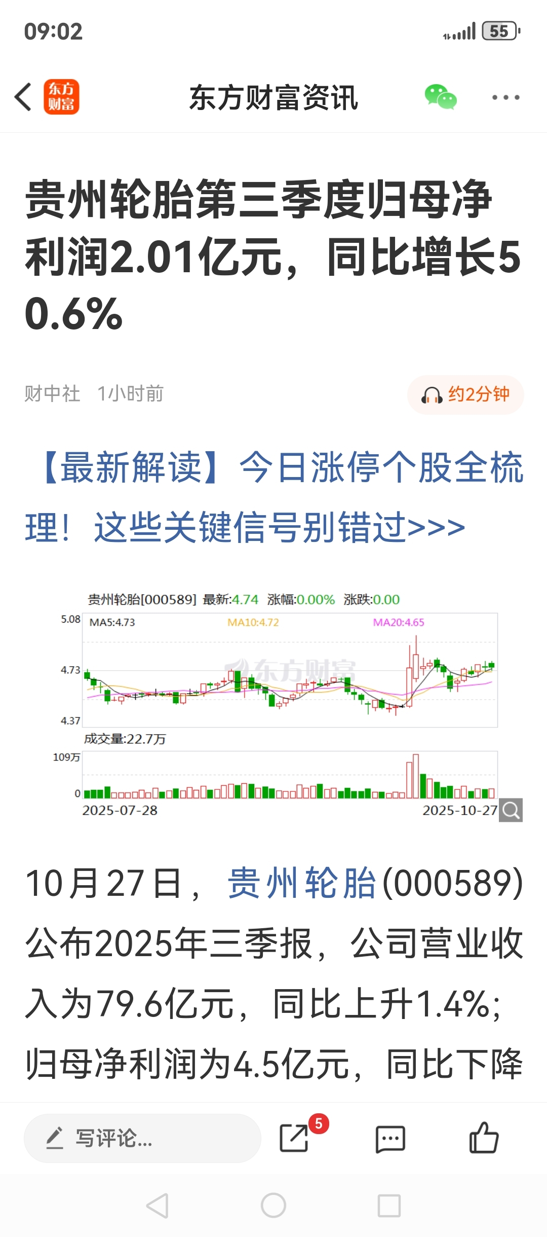 $贵州轮胎(SZ000589)$ 三季度净利润同比增长50.6%。