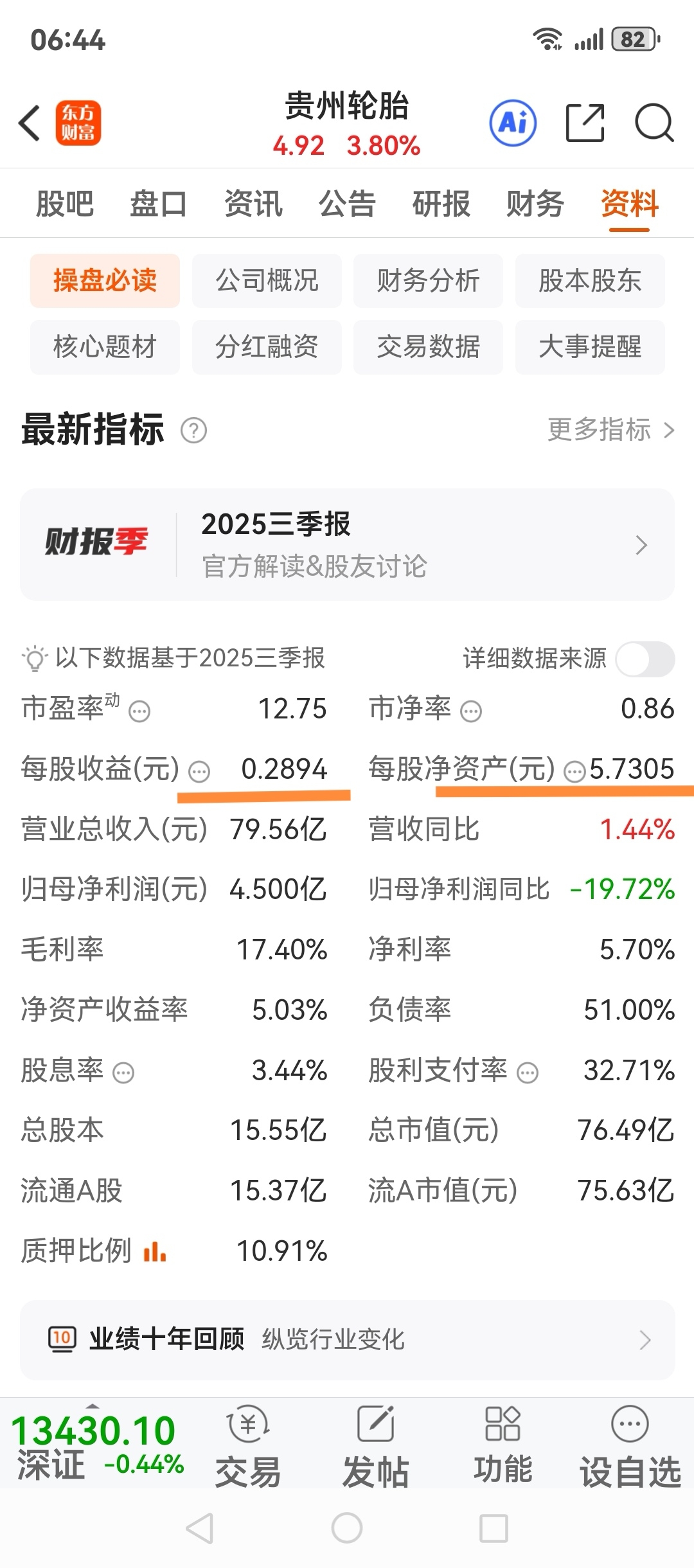 $贵州轮胎(SZ000589)$ 贵州轮胎三季报业绩0.29元.,中期分红0.4元,净资产5.73元,目标价6元。