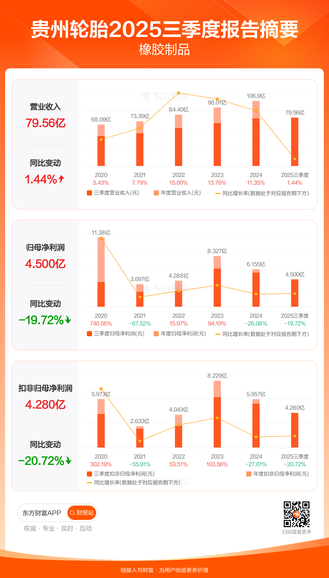 贵州轮胎10月28日发布2025年三季报显示,公司前三季实现营业收入79.56亿元,同比增长1.44%;归母净利润4.50亿元,同比下滑19.72%;扣非归母净利润4.28亿元,同比下滑20.72%。