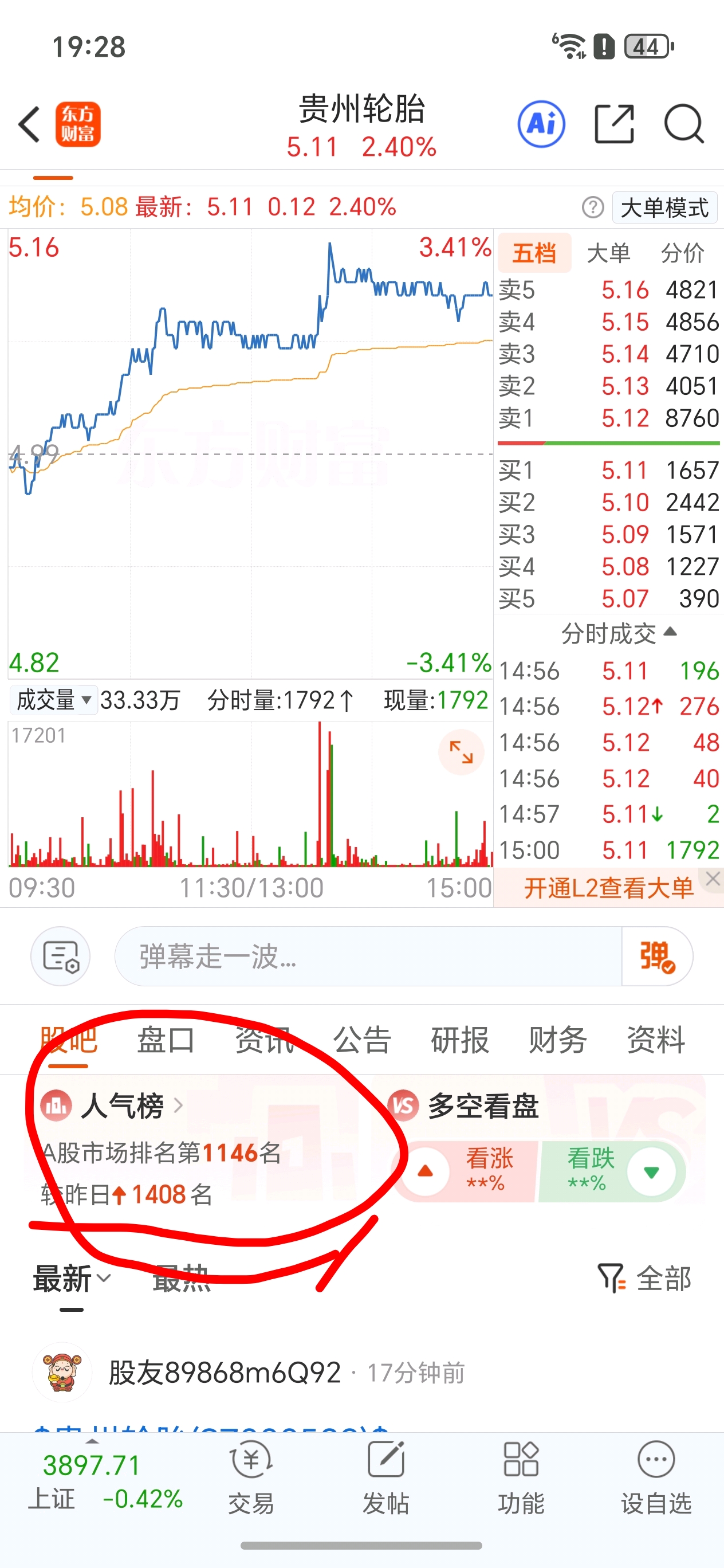$贵州轮胎(SZ000589)$ 今晚的人气榜突然上了1000多,难道明天要涨停了吗?