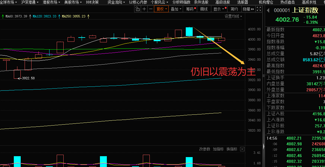 光伏、科技板块逆势活跃,市场缩量调整。市场量能大幅萎缩,第一个小时两市缩量1586亿元,预计全天成交不足2万亿元。大消费板块内部出现分歧,白酒方向震荡走弱,但乳业方向表现活跃,三元股份连续两个交易日涨停。指数高开低走,成交显著缩量,市场呈现出明显的蓄势整固特征。指数高开低走,题材快速轮动,市场在缩量中展开新一轮博弈。三大指数高开低走,集体呈现调整态势。沪指盘中险守4000点整数关口,创业板指一度跌超1%。从盘面看,板块分化明显。虽然指数承压,但场内仍有超过2700只个股飘红,显示出结构性机会依然存在。老k认为今天以震荡为主,操作上尽量聚焦新能源与消费。
