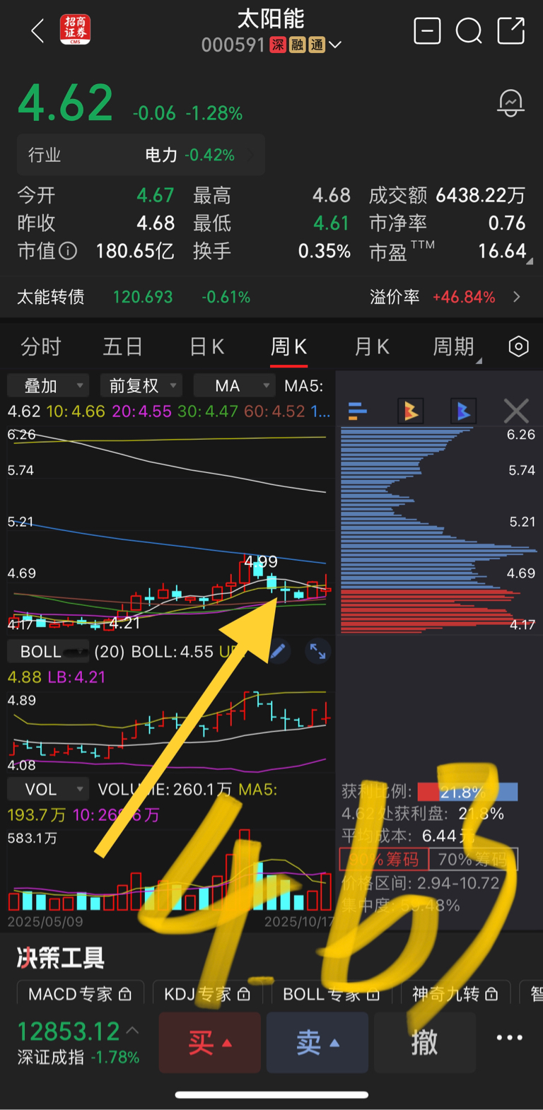 $太阳能(SZ000591)$ 你是不是周线调整?那以盘小于等于4.63