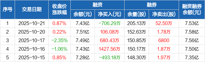 太阳能融资融券信息显示,2025年10月21日融资净偿还706.29万元;融资余额7.43亿元,较前一日下降0.94%。