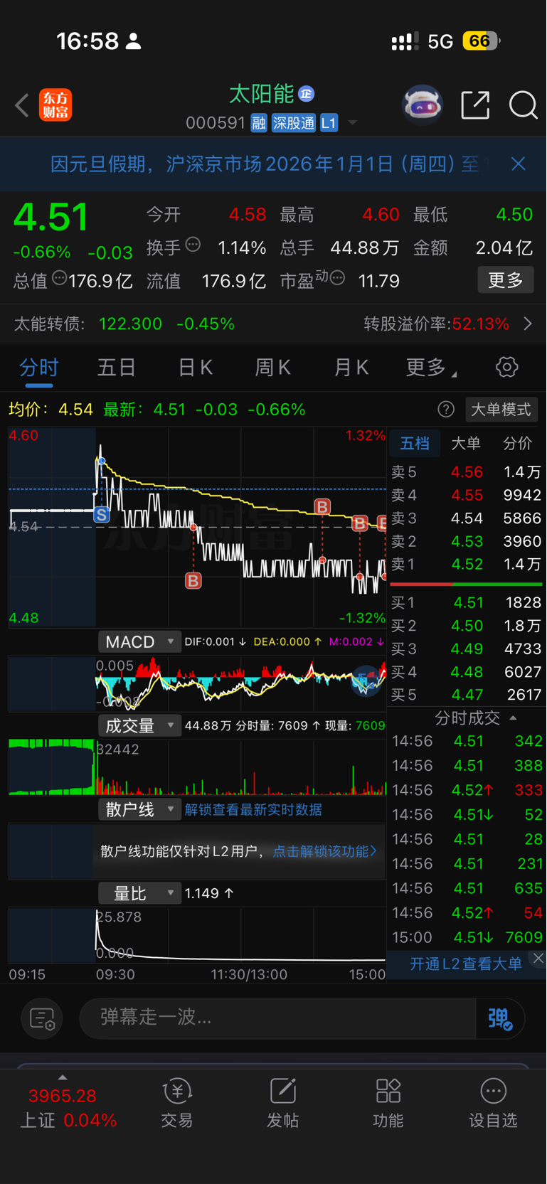 $太阳能(SZ000591)$ 今天幸亏4.58卖了大半