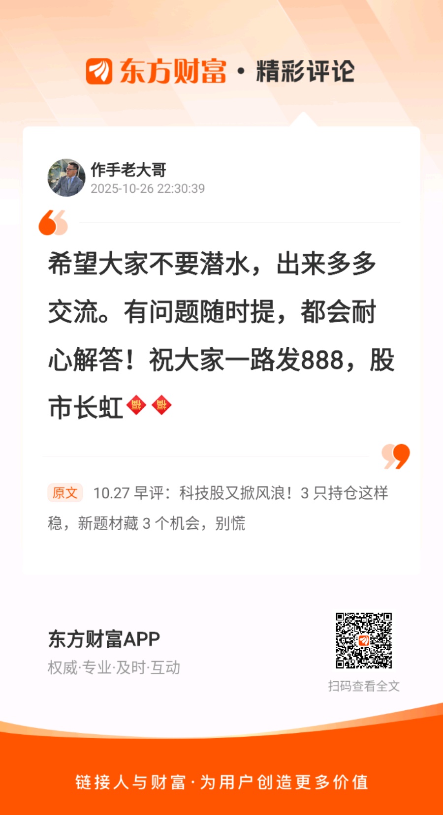 记住:财富的路上,心态是 1,技术、策略都是后面的 0,没有 1,再多 0 也没用。不管下周科技股是继续轮动,还是新题材冒头,我都会在这里陪你,一起面对波动,一起进步。稳住,我们能赢!
