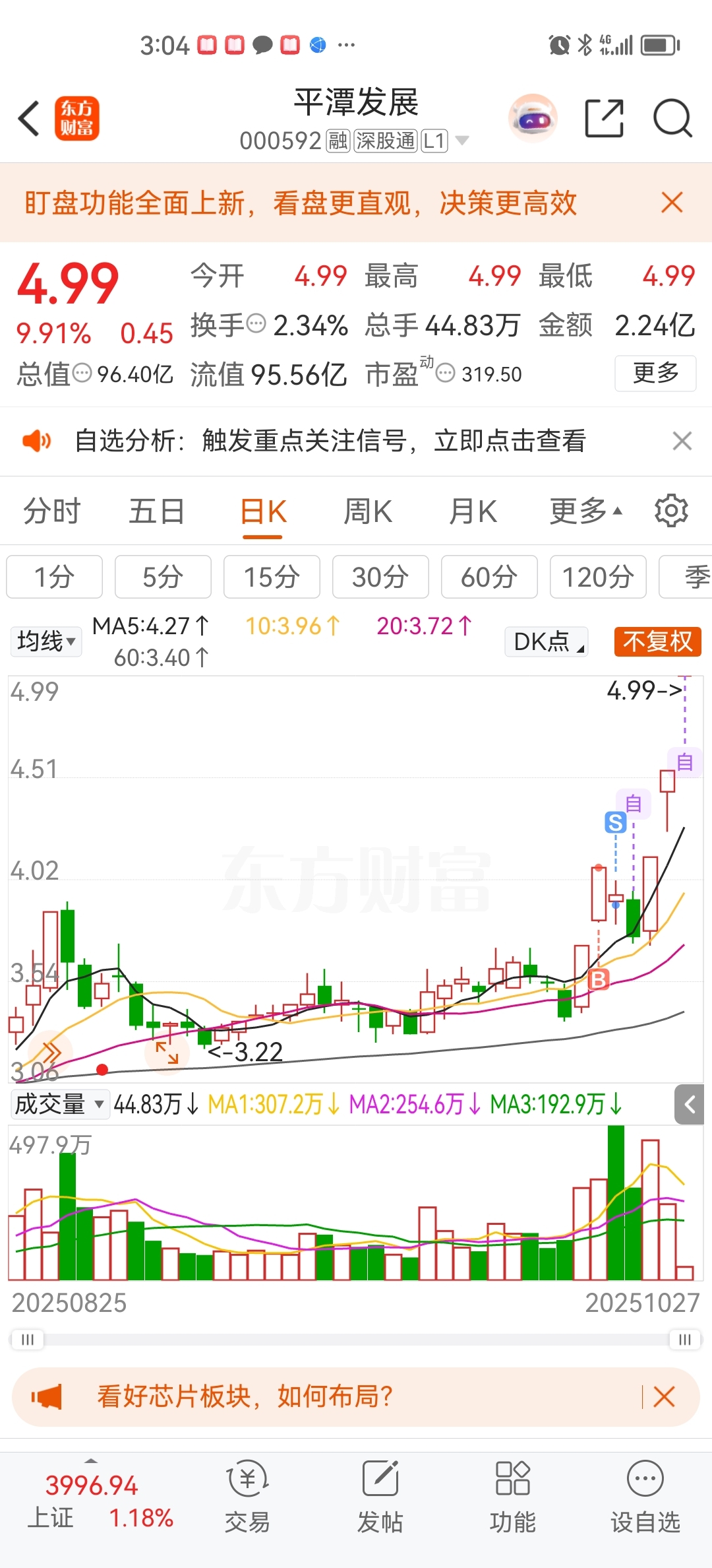 $平潭发展(SZ000592)$ 妥妥的小韭菜,错失三个板