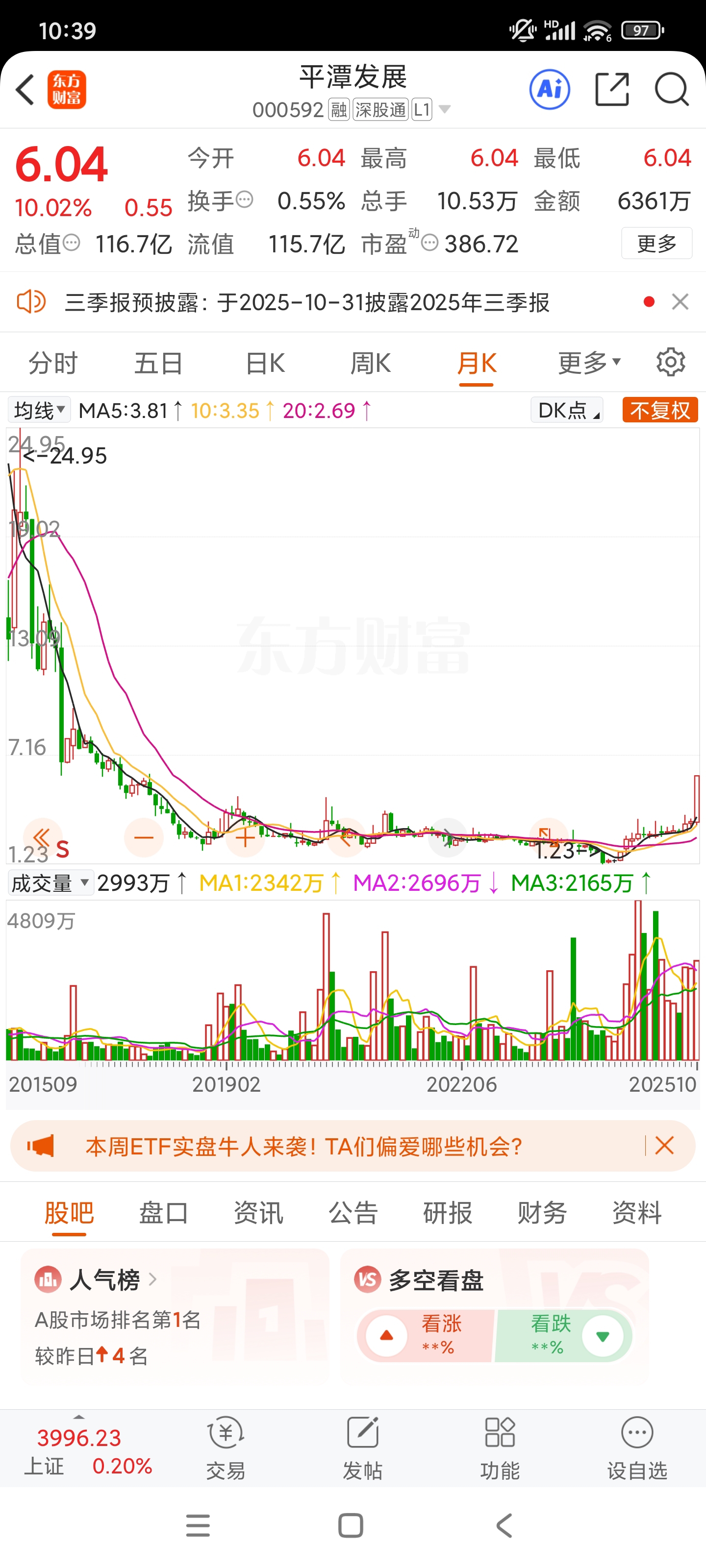 $平潭发展(SZ000592)$ 平潭发展,福建板块龙一,10月月线收光头大阳线,后市继续长期关注并持有,这几天短线可关注一下海南板块。