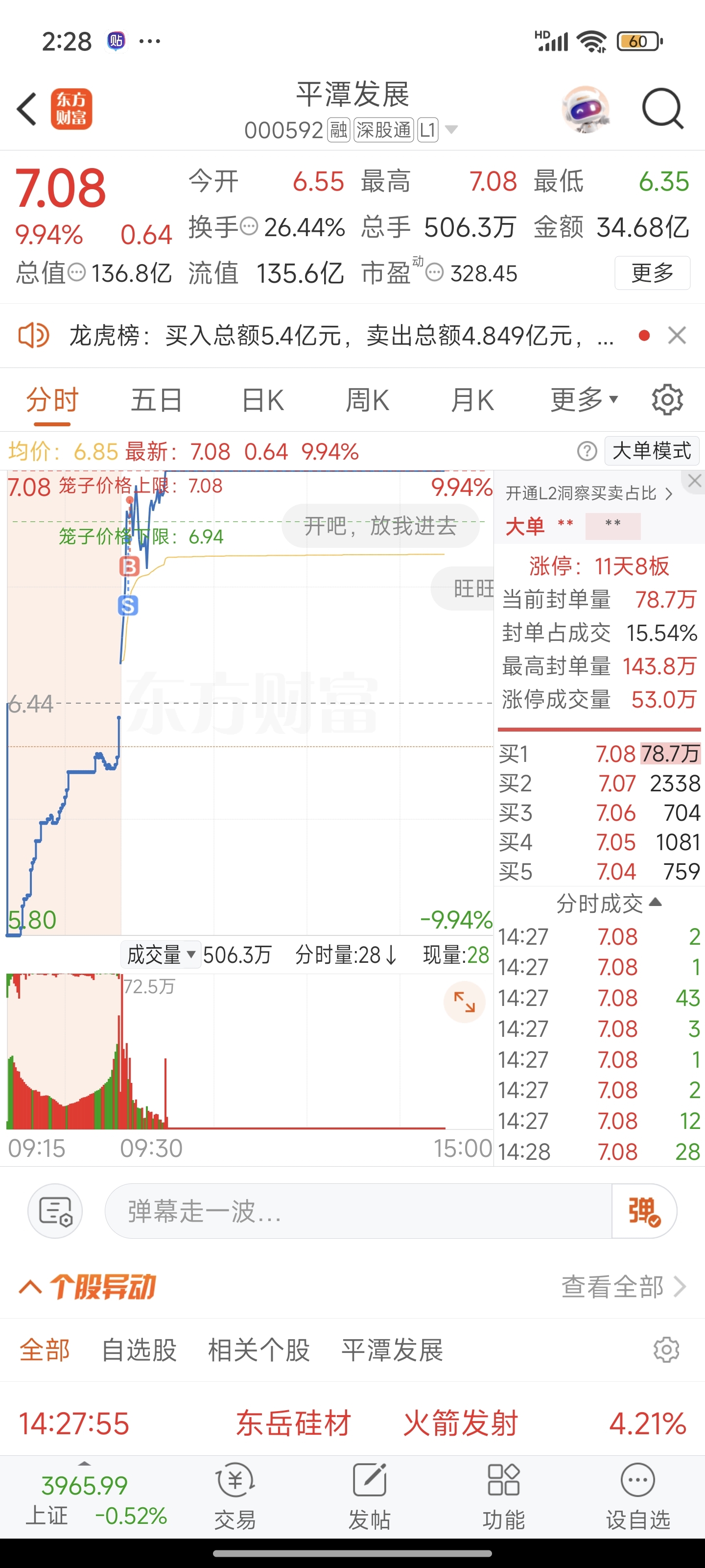 $平潭发展(SZ000592)$  卖飞龙头,发现自己做错了又赶紧买回来了,宁愿在高位接力龙头也不去杂毛,之前做杂毛亏了太多钱了。