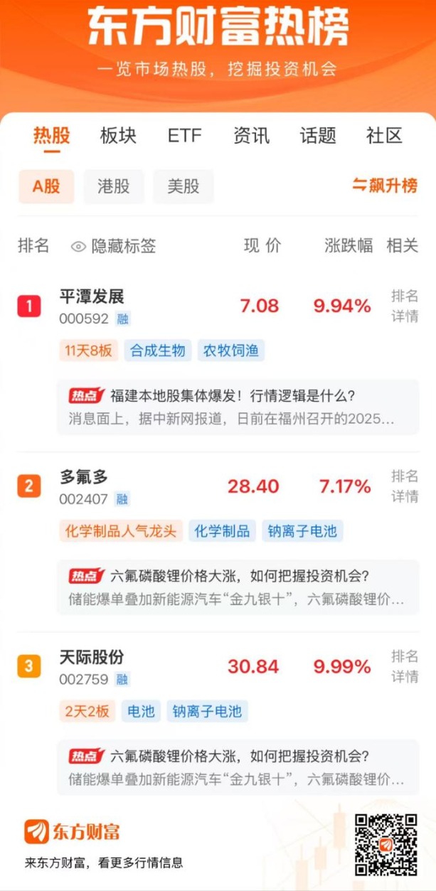 10月31日,两市震荡调整,创业板指领跌,但个股涨多跌少。东方财富热股榜前三的股票中,平潭发展位列第1,多氟多位列第2,天际股份位列第3。