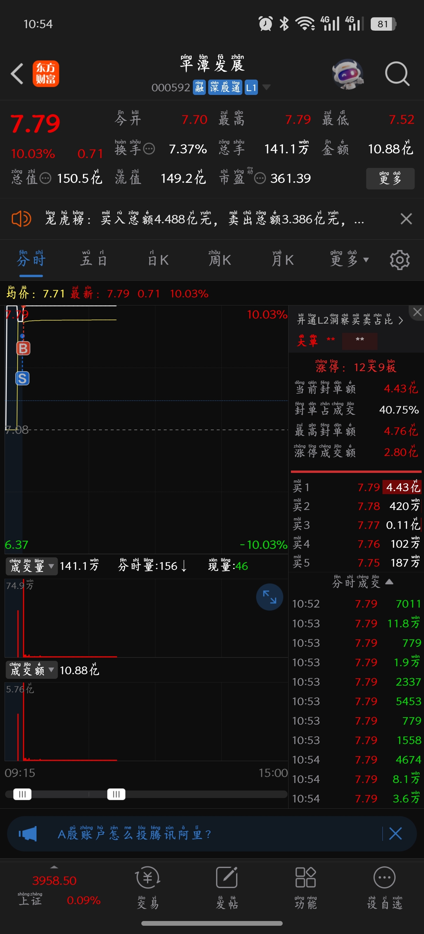 $平潭发展(SZ000592)$ 今天竞价结束7.65有一个4w手的买单,我毕竟是散户,如果跌破这个位置设置自动卖出,毕竟今天是触发异动,先把利润拿到,结果资金很认可这票,上周五的大资金肯定是洗出了一个去,但还是达成一致。明天可能会一字涨停。无视异动。恭喜车上的朋友们。