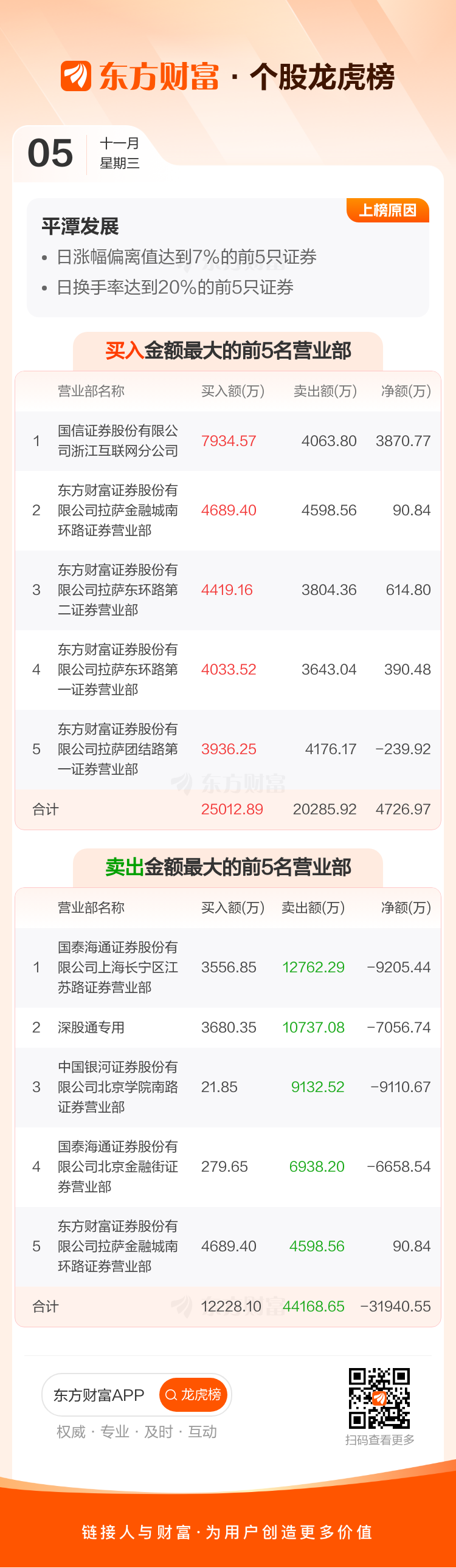 交易所2025年11月5日公布的交易公开信息显示,平潭发展因成为日涨幅偏离值达到7%的前5只证券、日换手率达到20%的前5只证券、连续三个交易日内,涨幅偏离值累计达到20%的证券上榜。平潭发展当日收报9.43元,涨跌幅10.04%,偏离值9.55%,换手率32.51%,成交额57.84亿。异常期间11月4日至11月5日,期间涨幅21.05%,累计偏离值21.95%,区间成交额89.00亿。