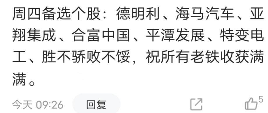 尊重市场!掌握规律!多看消息!看懂趋势!学会形态!把握机会!才能持续有所收获,我们要成长也要成功;集合竞价时间是衡量个股和抉择的重点方向之一,以后每天备选个股会在评论区盘前探讨,今天备选个股:德明利、海马汽车、亚翔集成、合富中国、平潭发展、特变电工、