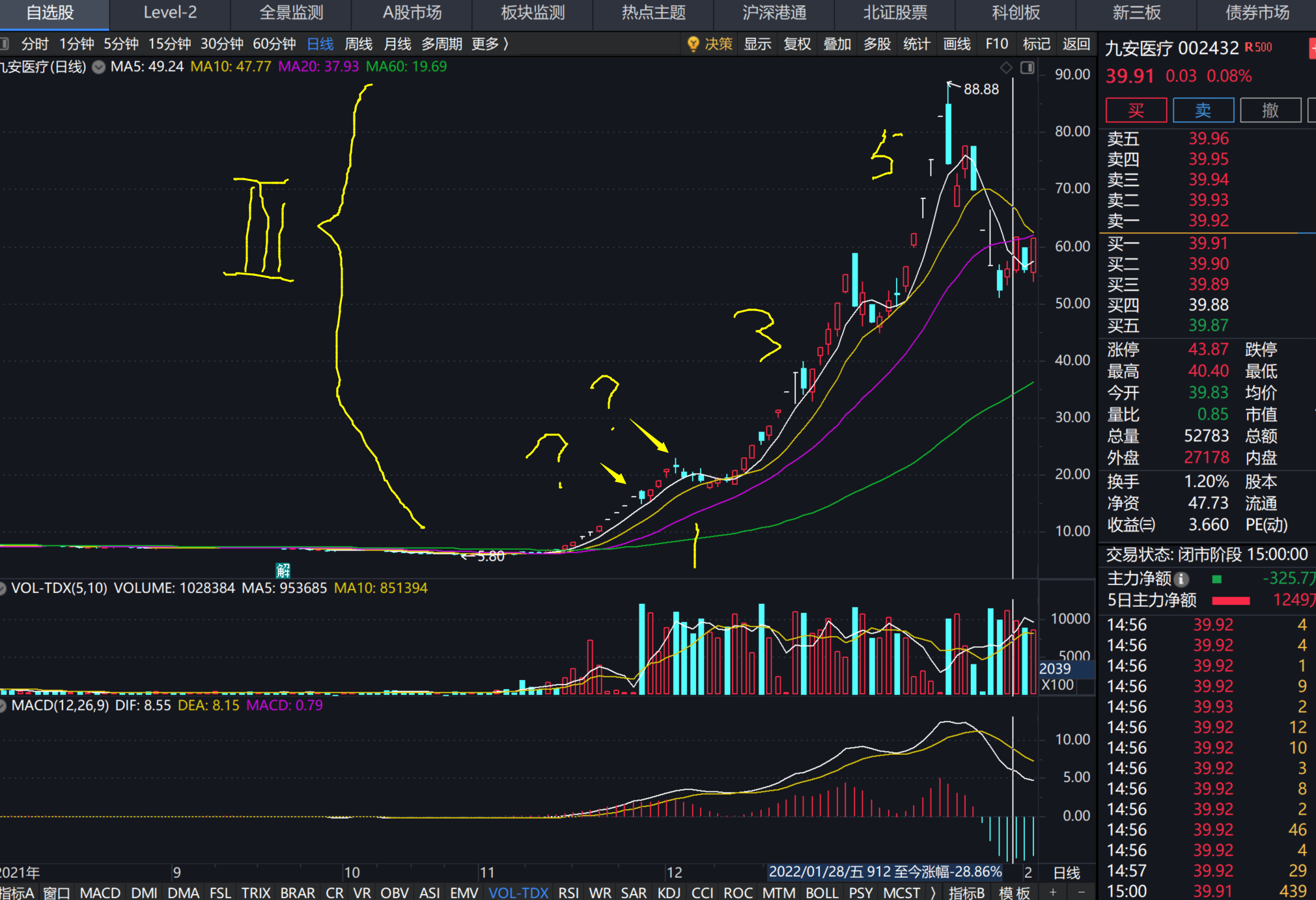 这里只画了大3,大5到90多元还没画;现在只是大3里的1浪?这个1浪都没运行完?今天这个调整是个小4浪调整???