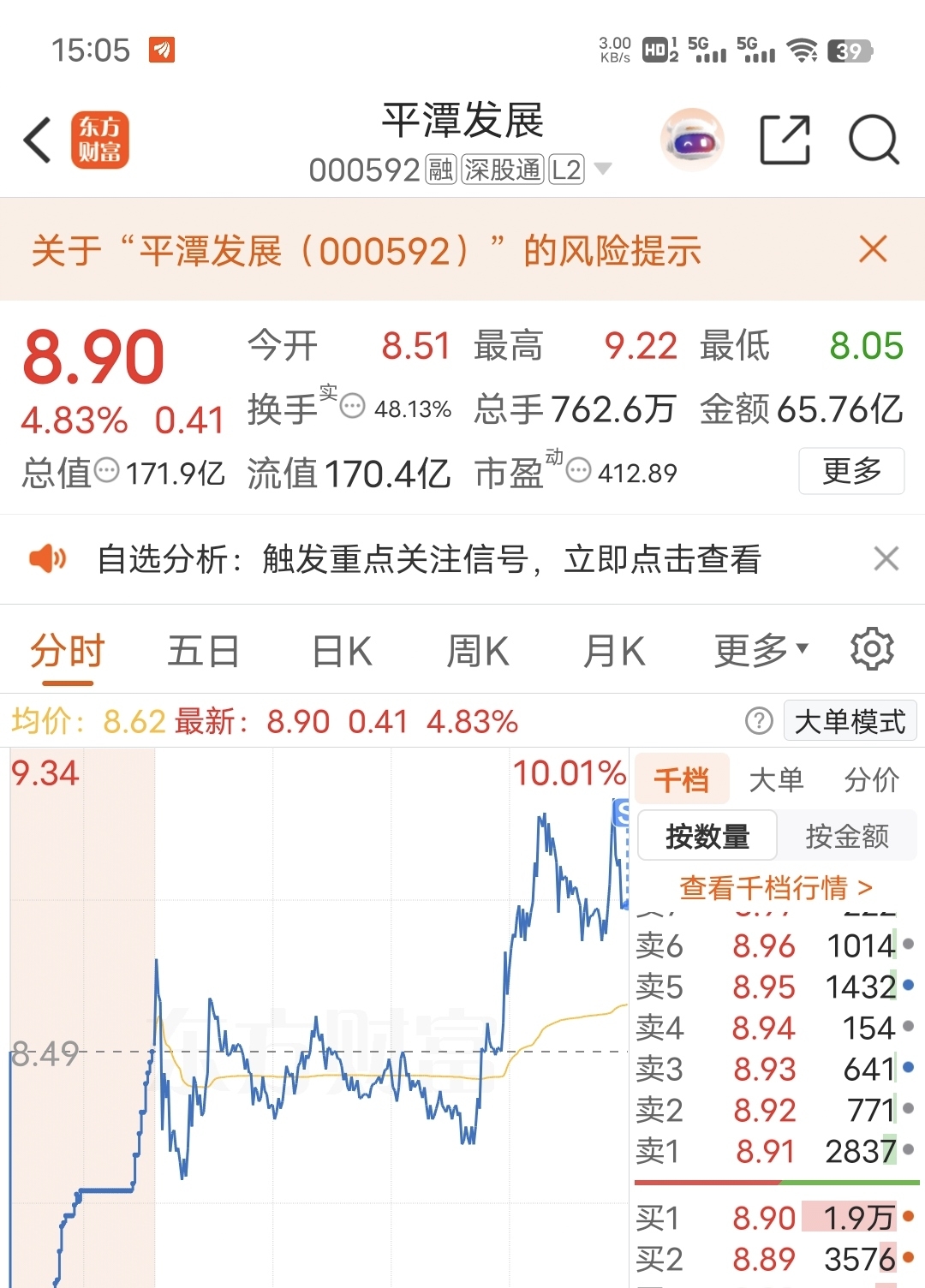 $平潭发展(SZ000592)$ 昨天拉大盘权重,指数回暖,抱团标的平潭也是开盘就被被砸至水下,板块方面也集体杀跌熄火,跌停后也是跟随参与了翘地板博弈次天大盘指数资金缩量回调抱团平潭,午盘也许是福建舰引起福建板块异动,资金回归承接又一次狂欢,各位老师不是上平潭就是合富,是打造龙首阴吗? 本想留着,想想最后一分钟出了下周有机会再看吧