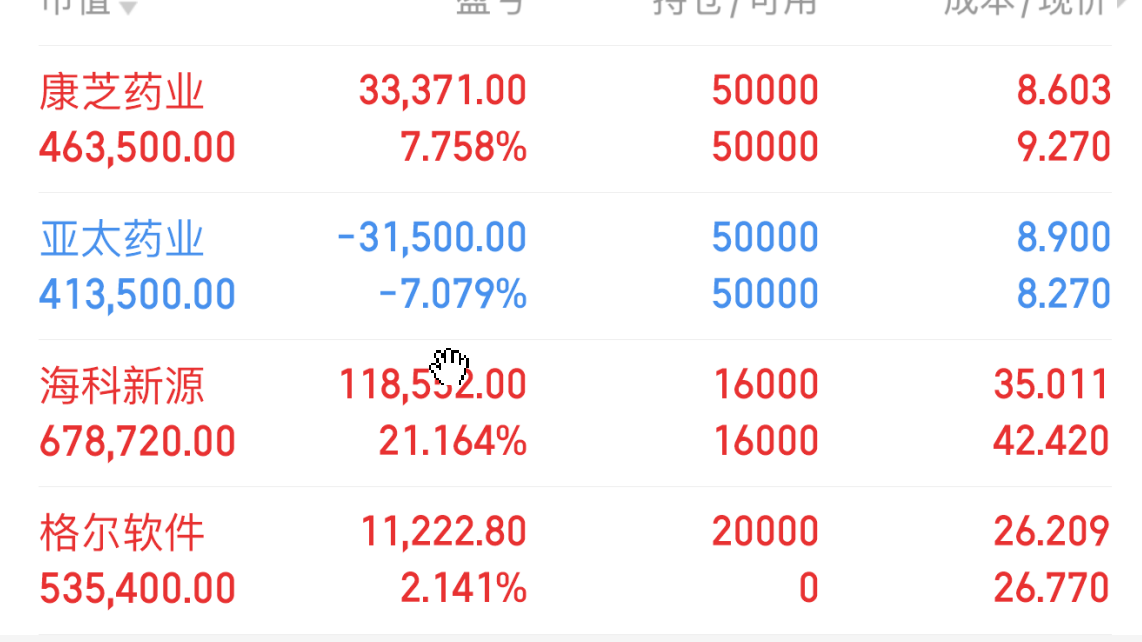 再说说我这周的持仓情况吧,有几只票表现还不错,算是吃到肉了。比如平潭发展、海科新源、康芝药业和福龙马,这几只都有不少浮盈;目前就只有亚太药业还在浮亏,不过问题应该不大,再等等看后续走势。