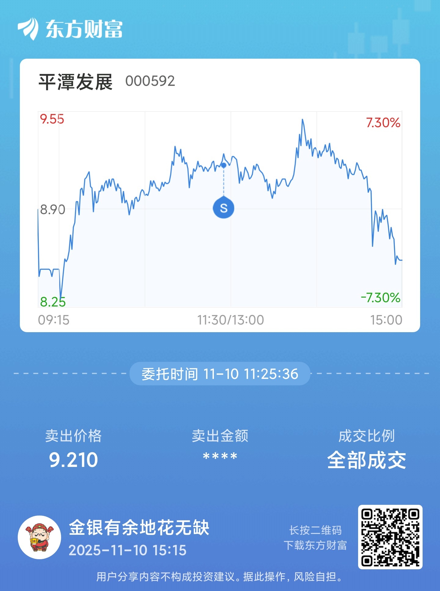 $平潭发展(SZ000592)$ 庆幸自己盘中卖了,虽然不是最高点卖的,但是对于收盘跳水来说还是把三个点利润收进口袋,这个开始走下坡路了,这段时间不看好