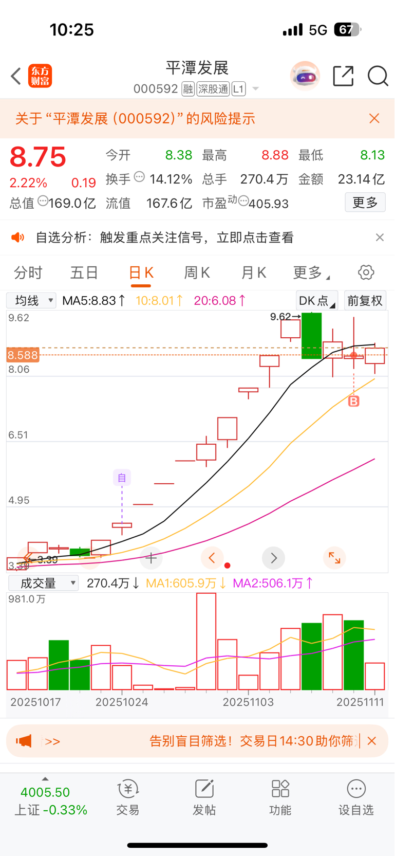 $平潭发展(SZ000592)$ 昨天收盘买的,挂了8.05的买单和8.96的卖单