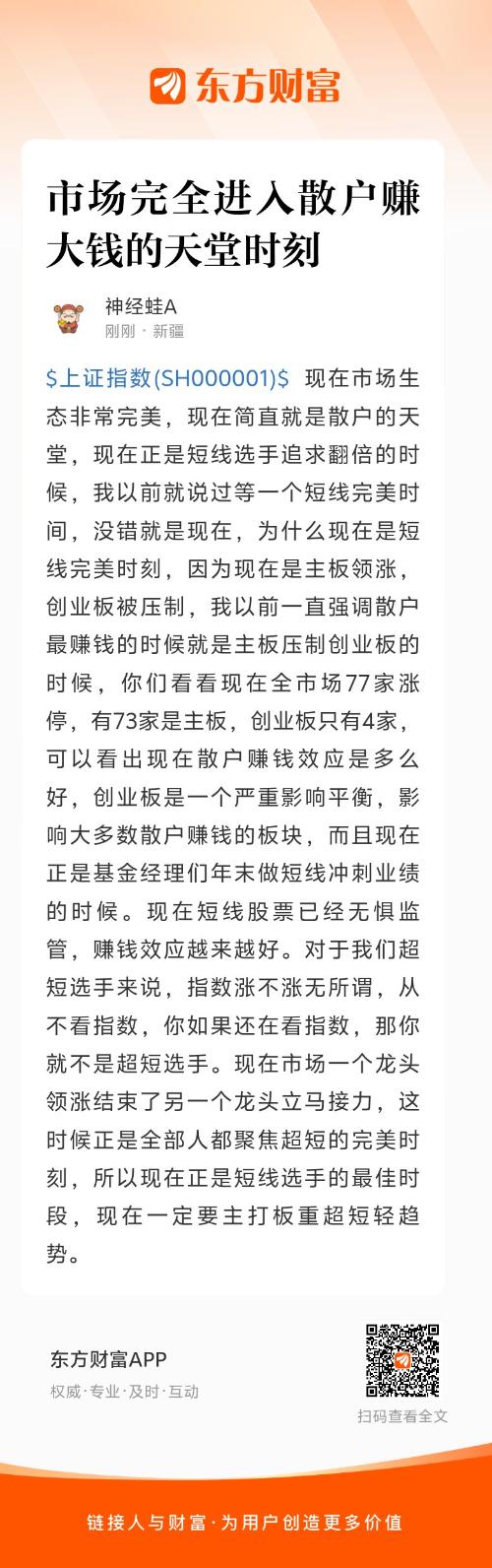 $上证指数(SH000001)$ 现在市场生态非常完美,现在简直就是散户的天堂,现在正是短线选手追求翻倍的时候,主打板重超短轻指数抛趋势。我以前就说过等一个短线完美时间,没错就是现在,为什么现在是短线完美时刻,因为现在是主板领涨,创业板被压制,我以前一直强调散户最赚钱的时候就是主板压制创业板的时候,你们看看现在全市场77家涨停,有73家是主板,创业板只有4家,可以看出现在散户赚钱效应是多么好,创业板是一个严重影响平衡,影响大多数散户赚钱的板块,而且现在正是基金经理们年末做短线冲刺业绩的时候。现在短线股票已经无惧监管,赚钱效应越来越好。对于我们超短选手来说,指数涨不涨无所谓,从不看指数,你如果还在看指数,那你就不是超短选手。现在市场一个龙头领涨结束了另一个龙头立马接力,这时候正是全部人都聚焦超短的完美时刻,所以现在正是短线选手的最佳时段,现在一定要主打板重超短轻趋势抛趋势。