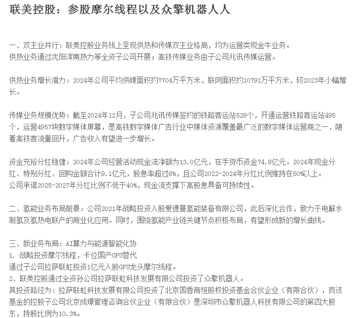 联美控股:参股摩尔线程和众擎机器人。
