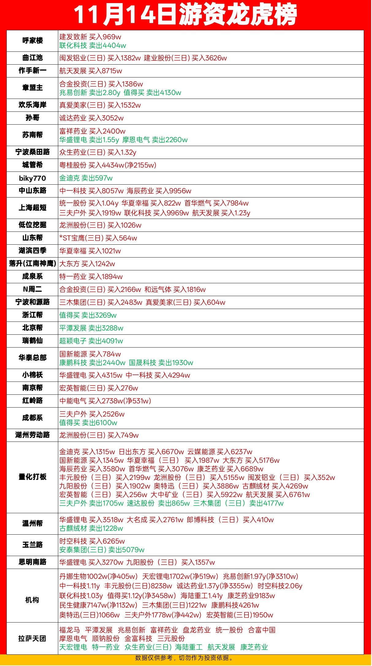 11.14游资龙虎榜,呼家楼章盟主作手新一上榜。