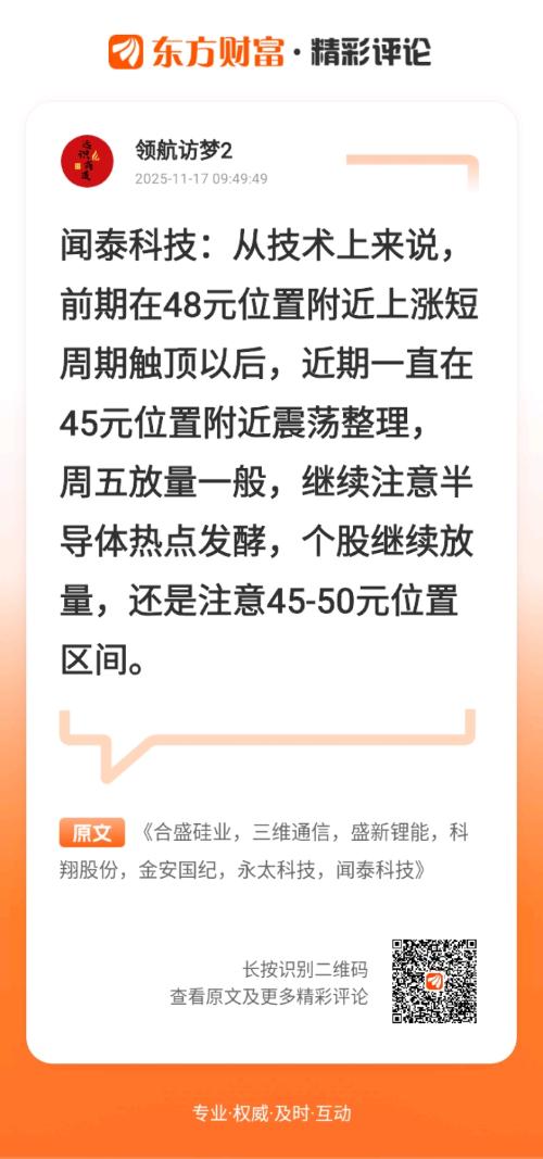 //@领航访梦2 :闻泰科技:从技术上来说,前期在48元位置附近上涨短周期触顶以后,近期一直在45元位置附近震荡整理,周五放量一般,继续注意半导体热点发酵,个股继续放量,还是注意45-50元位置区间。 $平潭发展(SZ000592)$$孚日股份(SZ002083)$$长城军工(SH601606)$