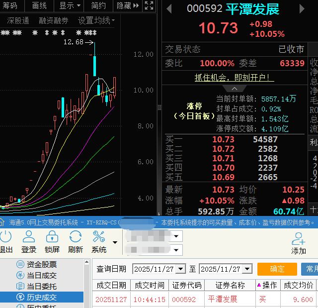000592平潭发展 昨天上午9.6元买入今天涨停10.73元,这票我每次买入收获都非常不错,上次买入后三连板看这次有几个哈!